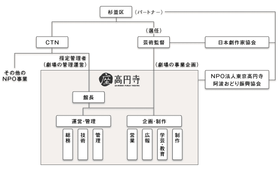 芸術監督には、座・高円寺開館より地域における舞台芸術の創造や教育の実現に携わってきた佐藤信に次いで、公募で選ばれたシライケイタが2023年7月より就任。企画・運営は、杉並区から指定管理者として業務の委任を受けたアート系NPO法人劇場創造ネットワーク(CTN)が担います。区がパートナーシップを結ぶ日本劇作家協会との協力により、ワークショップや人材育成、現代劇の戯曲とそれに関わる資料の収集・保管といった、より高い専門性をもった事業を展開すると共に、優れた作品の再演や、絵本の読み聞かせ・ワークショップを始めとする子どもたちに向けた多彩な事業、大道芸や阿波おどり、街をあげた文化祭、演芸まつりなど季節ごとの地域のお祭り開催に向けての支援など、地域の公共劇場として「芸術性」と「親しみやすさ」とのバランスの良い、「座・高円寺」の独自の個性を創出していきます。
