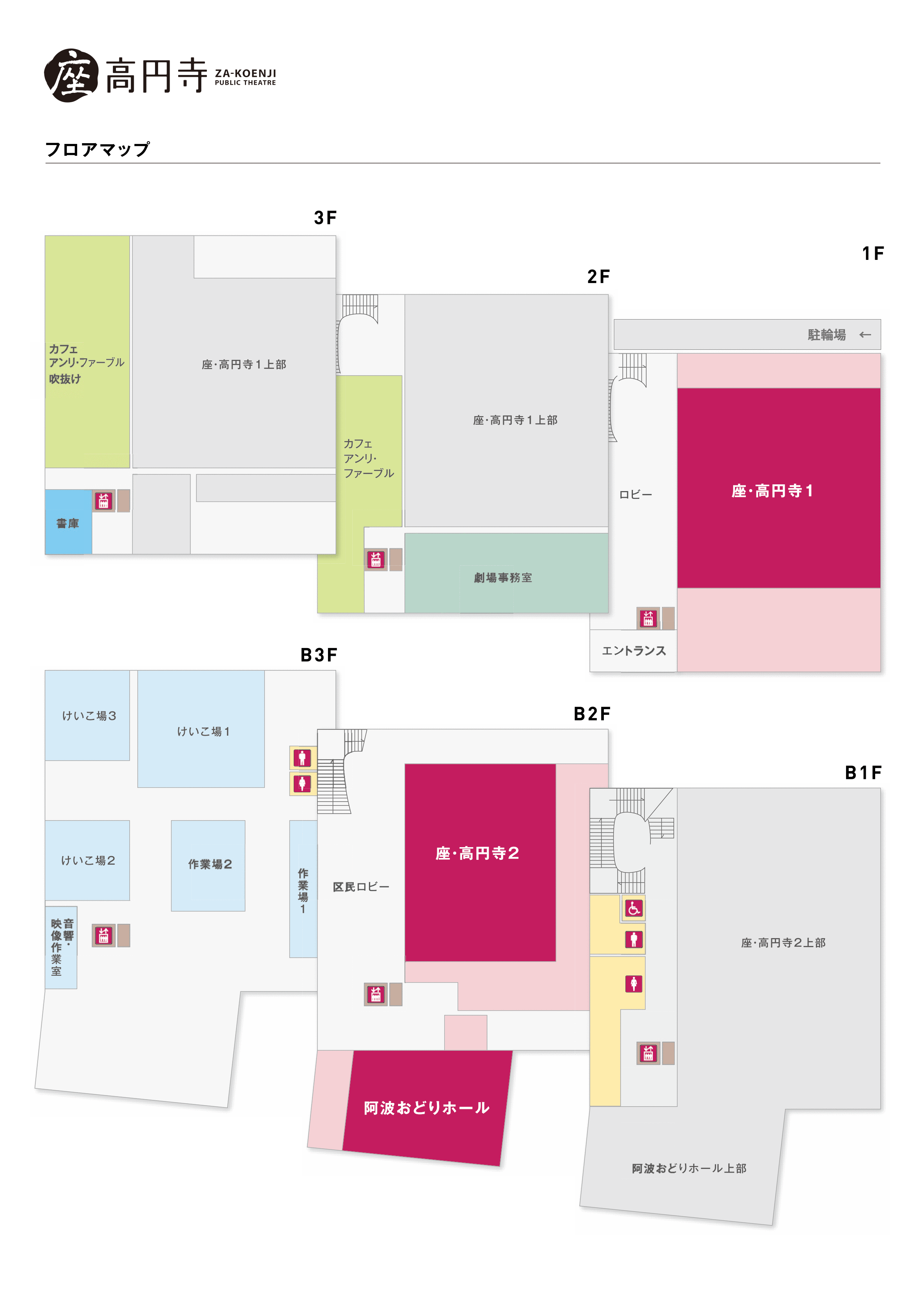 「座・高円寺」には3つの個性的なホールが集まっています。客席が可動することで自由な表現空間を作ることができる「座・高円寺1」(基本形状 客席数233)、スタンダードな劇場空間で、質の高さと使いやすさを併せ持つ「座・高円寺2」(客席数256~298)、そして高円寺の阿波おどりを支える奥行きのある空間「阿波おどりホール」です。いずれも舞台芸術の創造と発信の場として、そして区民のみなさんの文化活動の拠点として、多くの方に広く親しまれる空間に育ててまいります。